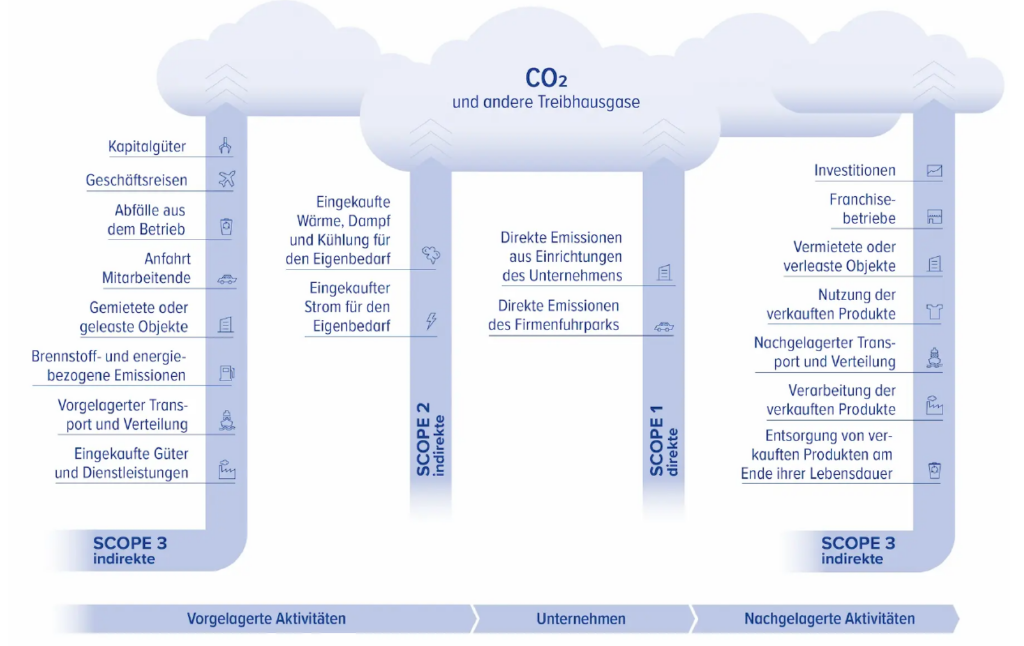 - Scope 3: Emissionen, die indirekt durch die Unternehmensaktivität entlang der Wertschöpfungskette entstehen (z.B. Logistik, Anfahrt der Mitarbeitenden)